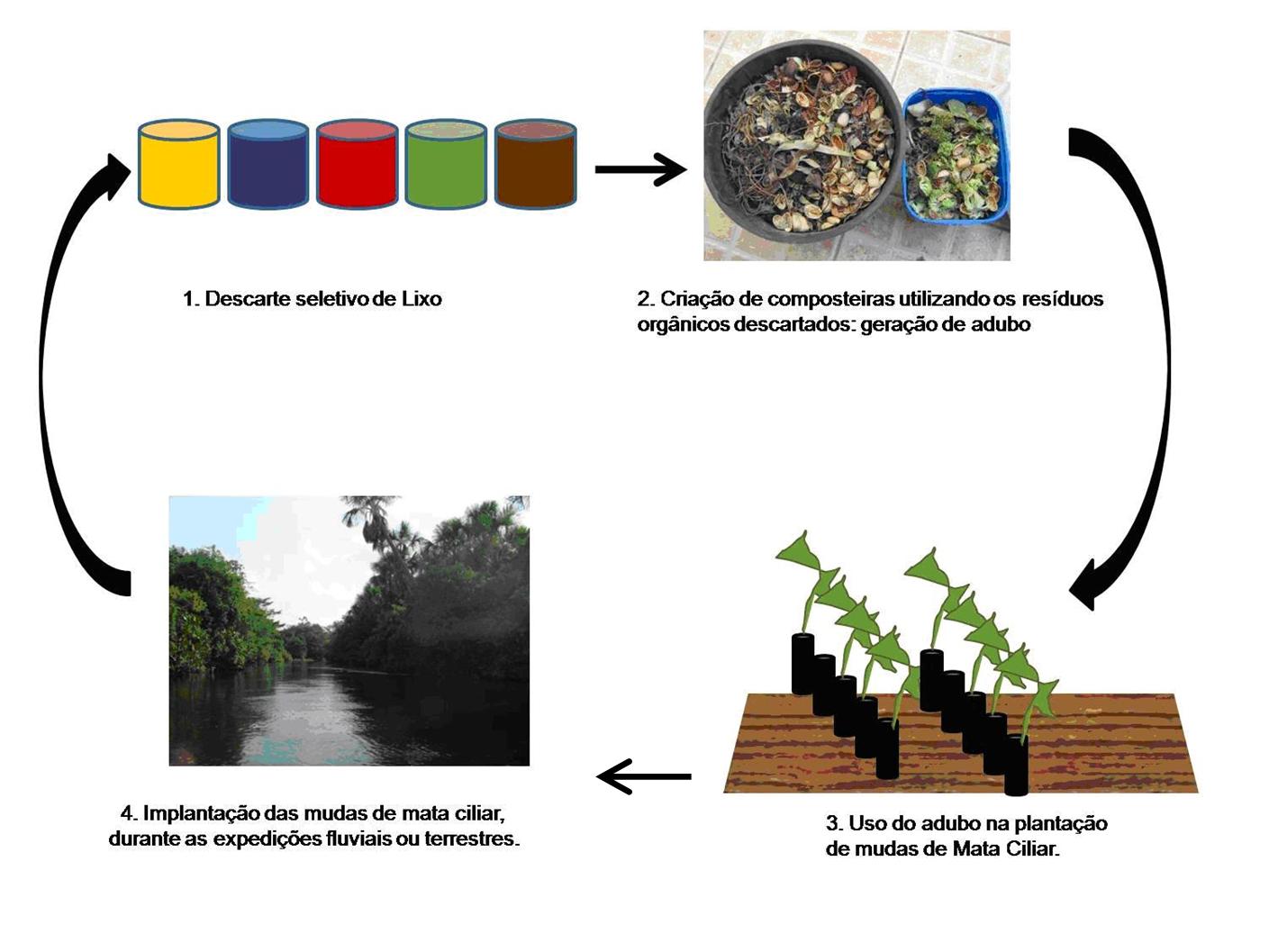 Além disso, os resíduos orgânicos serão utilizados para produção de adubo, que, por sua vez, poderá ser usado para germinação de sementes de árvores típicas de mata ciliar. O projeto como um todo funcionará em circuito, cujo esquema pode ser conferido na Figura que segue logo mais abaixo.